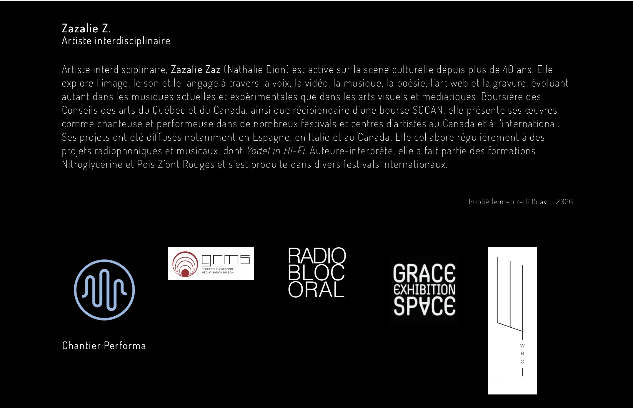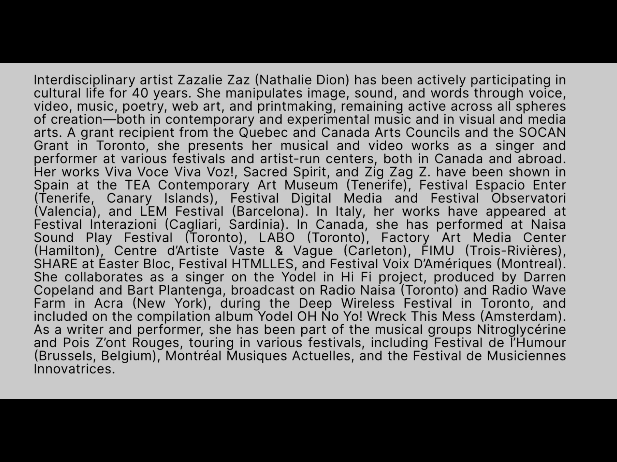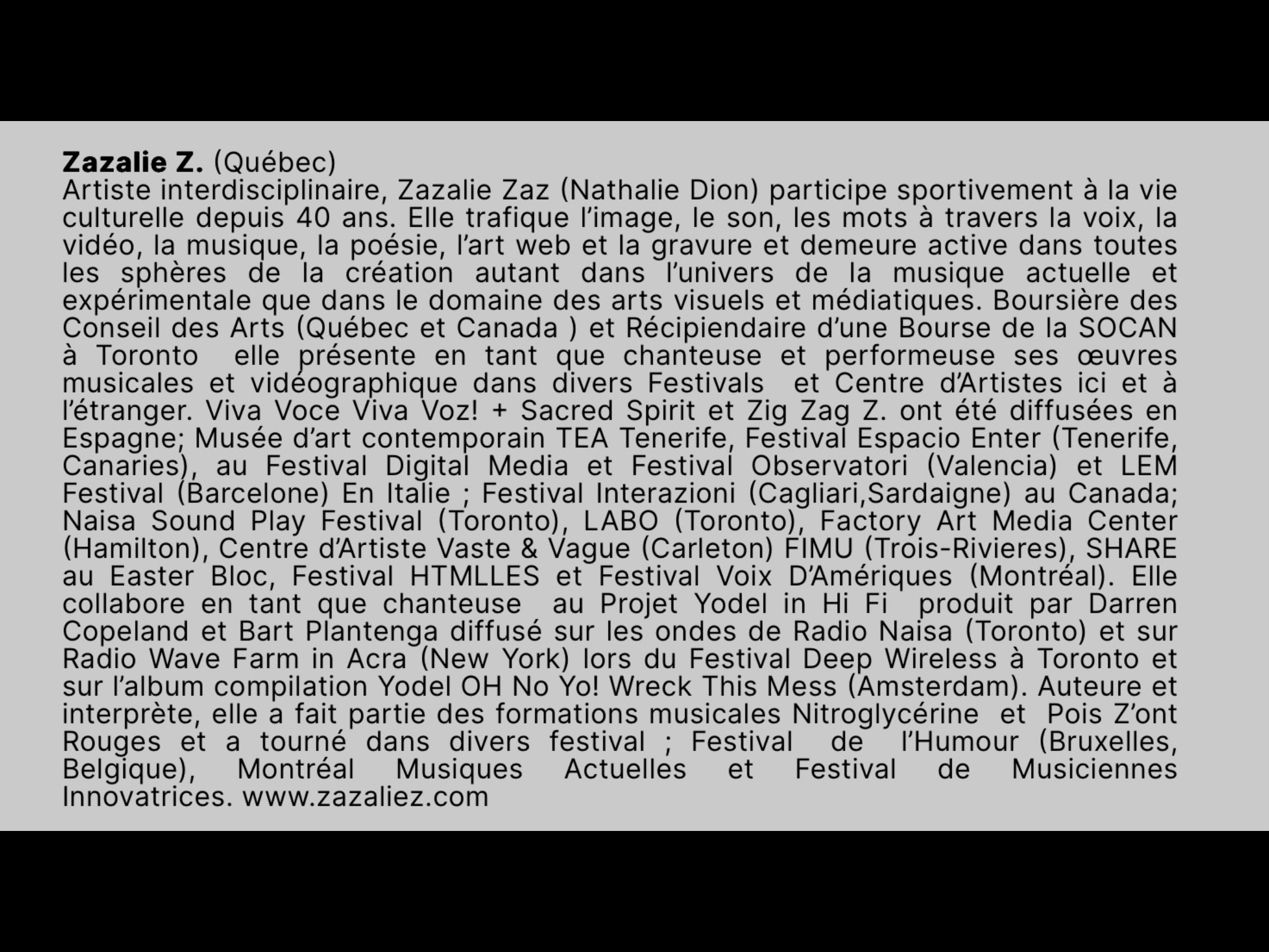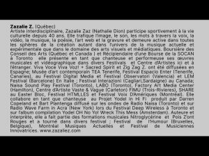 Artiste interdisciplinaire, Zazalie Zaz (Nathalie Dion) participe sportivement à la vie culturelle depuis 40 ans. Elle trafique l’image, le son, les mots à travers la voix, la vidéo, la musique, la poésie, l’art web et la gravure et demeure active dans toutes les sphères de la création autant dans l’univers de la musique actuelle et expérimentale que dans le domaine des arts visuels et médiatiques. Boursière des Conseil des Arts (Québec et Canada ) et Récipiendaire d’une Bourse de la SOCAN à Toronto elle présente en tant que chanteuse et performeuse ses œuvres musicales et vidéographique dans divers Festivals et Centre d’Artistes ici et à l’étranger. Viva Voce Viva Voz! + Sacred Spirit et Zig Zag Z. ont été diffusées en Espagne; Musée d’art contemporain TEA Tenerife, Festival Espacio Enter (Tenerife, Canaries), au Festival Digital Media et Festival Observatori (Valencia) et LEM Festival (Barcelone) En Italie ; Festival Interazioni (Cagliari,Sardaigne) au Canada; Naisa Sound Play Festival (Toronto), LABO (Toronto), Factory Art Media Center (Hamilton), Centre d’Artiste Vaste & Vague (Carleton) FIMU (Trois-Rivieres), SHARE au Eastern Bloc, Festival HTMLLES et Festival Voix D’Amériques (Montréal). Elle collabore en tant que chanteuse au Projet Yodel in Hi Fi produit par Darren Copeland et Bart Plantenga diffusé sur les ondes de Radio Naisa (Toronto) et sur Radio Wave Farm in Acra (New York) lors du Festival Deep Wireless à Toronto et sur l’album compilation Yodel OH No Yo! Wreck This Mess (Amsterdam). Auteure et interprète, elle a fait partie des formations musicales Nitroglycérine et Pois Z’ont Rouges et a tourné dans divers festival ; Festival de l’Humour (Bruxelles, Belgique), Montréal Musiques Actuelles et Festival de Musiciennes Innovatrices.